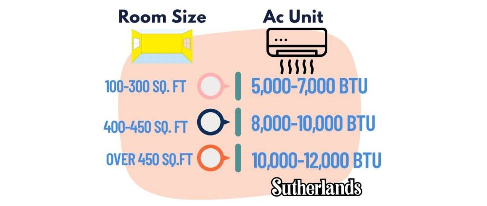 - For rooms larger than that, choose a unit that is 10,000 to 12,500 BTU’s.