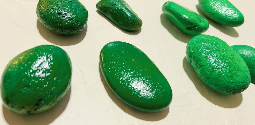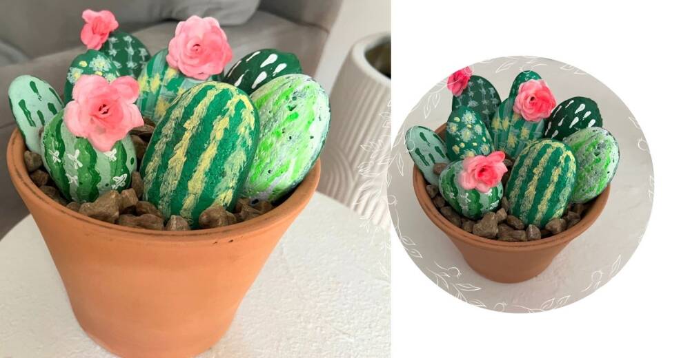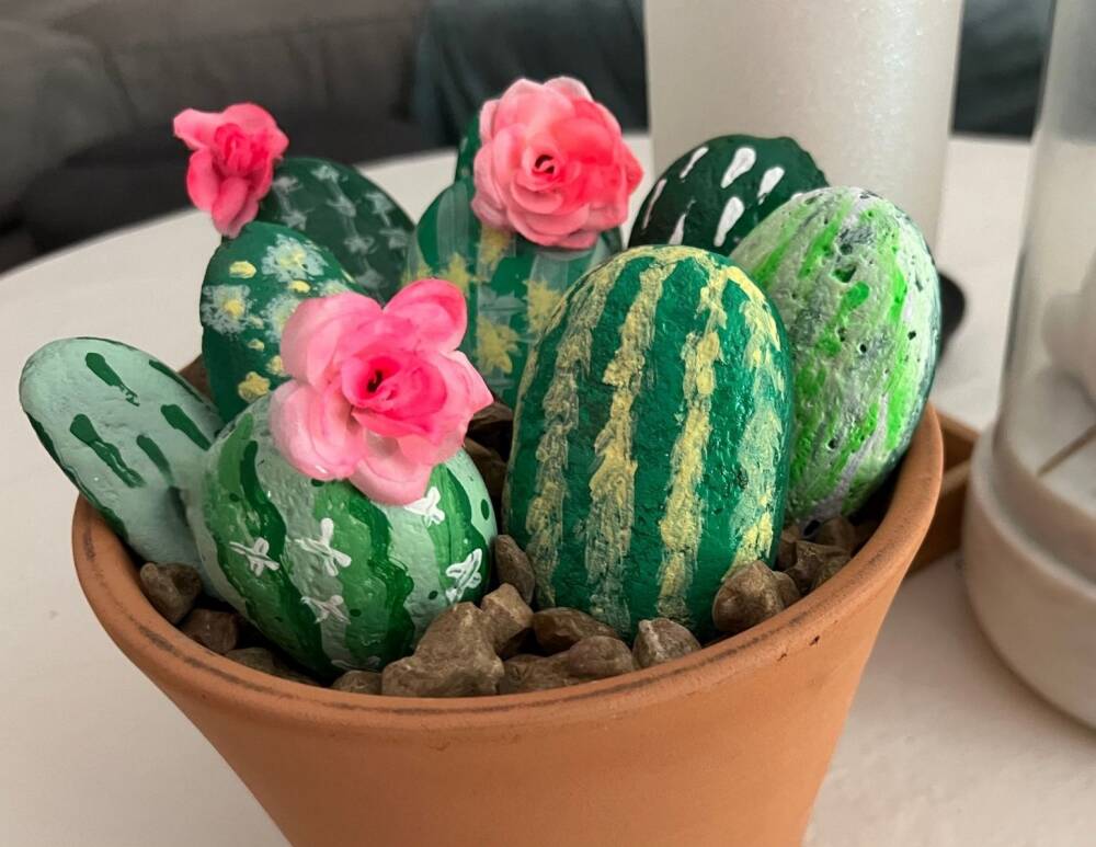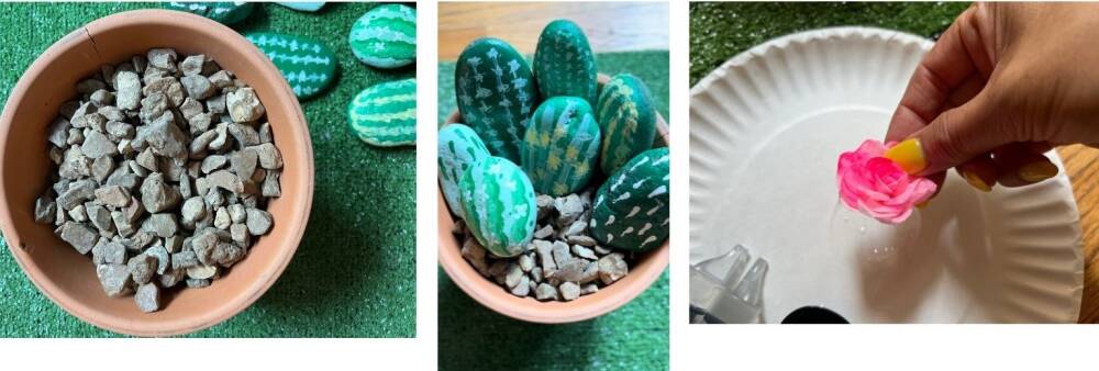 Fill the clay pot with river pebble and place all the painted cacti on top. If you want to display this on all sides, you will have to paint both sides of the rocks. Once they are in place, glue the flowers on a few rocks.