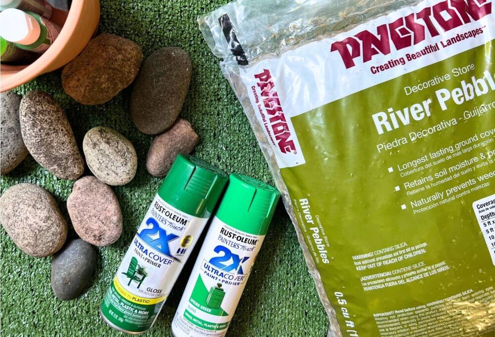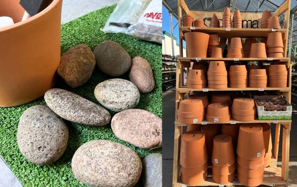 First, find the right size rocks and the pot. They should be proportionate to each other. We used a bit bigger rock for this 6" clay pot. It holds about 8 cacti. Look for more oval-shaped rocks just like the real cactus pads.