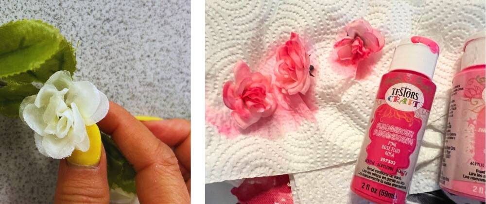 So let’s make some flowers. We decided to dye the artificial white rose buds using pink craft paint diluted in water. Let them soak for a few hours and they look as good as real cactus flowers.