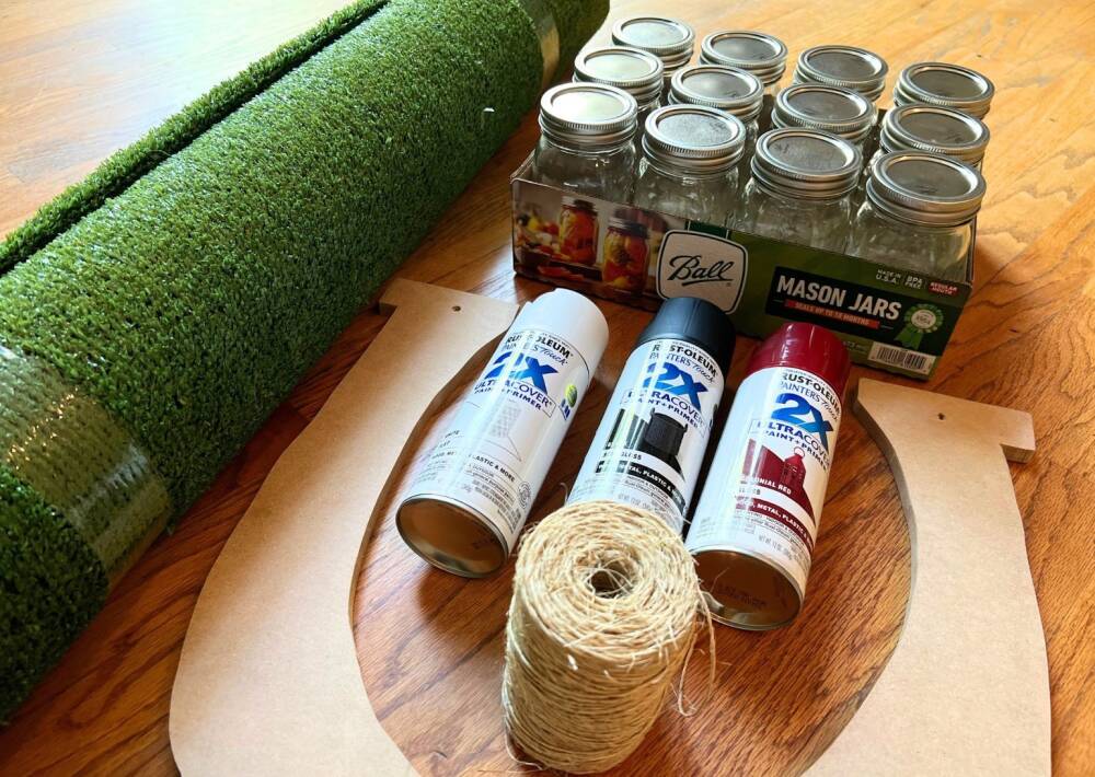 Artificial grass turf is a must-have at this party. We used a tabletop tray and cut the turf to fit right in. No gluing is required! We hot glued the red bows onto the mason jars to coordinate with the red and white theme. So easy and fun!  (Dig out your kids’ old toys. The big horse looks like porcelain, but it is all plastic thanks to the magic of gloss paint!)