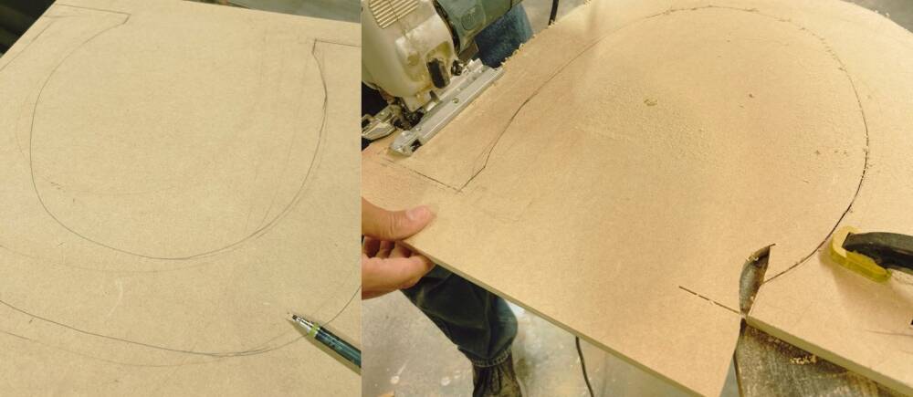 We used a smooth precut fiberboard for this project. You can print out a pattern or draw the shape of the horseshoe yourself. We ended up with 18.5" wide x 17" tall. Clamp the board to the sawhorse and start cutting.