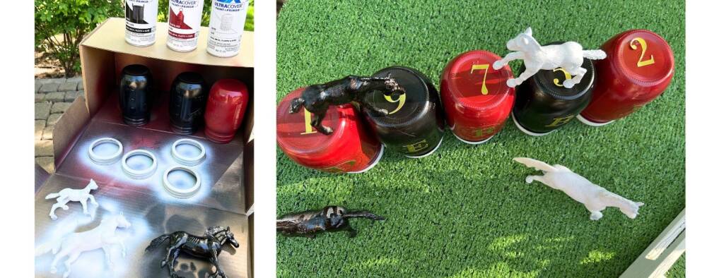 Our color scheme is red, black, white, and gold. You can determine what you want the jar lettering to say: Derby, Party, Year, etc. We sprayed the lid in white and alternating red/black colors to spell “DERBY”. The horse figurines added a fun touch to this project. Many Sutherlands stores have vintage toys and horse figurines in stock. Spray paint to the desired color scheme.