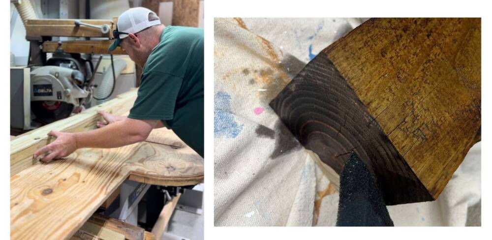 Now let’s make the seat. The original 4x4 is about 12 feet long. For easier transporting, Sutherlands staff is happy to cut them. We have 3 pieces of 4 ft wide for our seating. You can stain or paint treated lumbuer in any color of your choosing. This one is Early American 203 from Minwax.