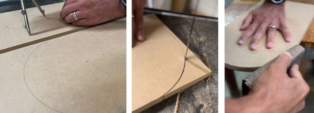 To draw half circles, mark the center of the side panels where you will drill the hole for the pipe and mark the highest point. Use a protractor to draw the half oval. Use a band saw or reciprocating saw to cut along the line. Smoothen rough edges with sandpaper.