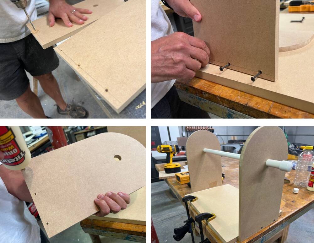 Predrill the nail holes on both side panels. We used fiberboard, it is not the strongest. This will avoid any splitting once you screw in the nails. For extra strength, apply glue first before drilling the nails to attach. Let dry.