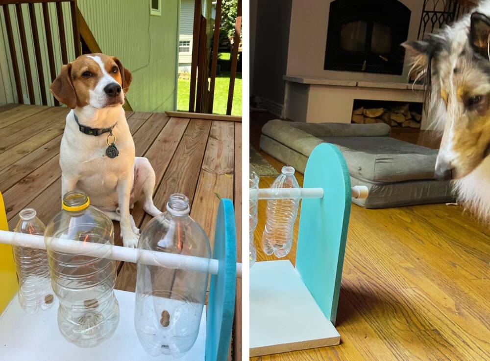 Cut the hole close to the bottle opening (as shown) at each end to thread the pipe through. Pipe caps will keep it from sliding out. Give it a spin to make sure it won’t get stuck and that it can flip all the way around smoothly. We suggest trying with one bottle first. Experiment with a different size bottle depending on the size of your dog.
