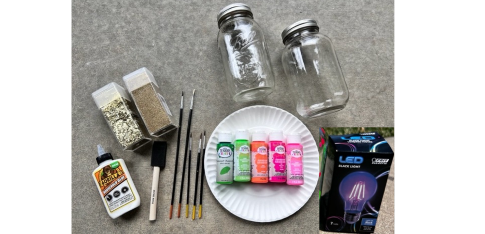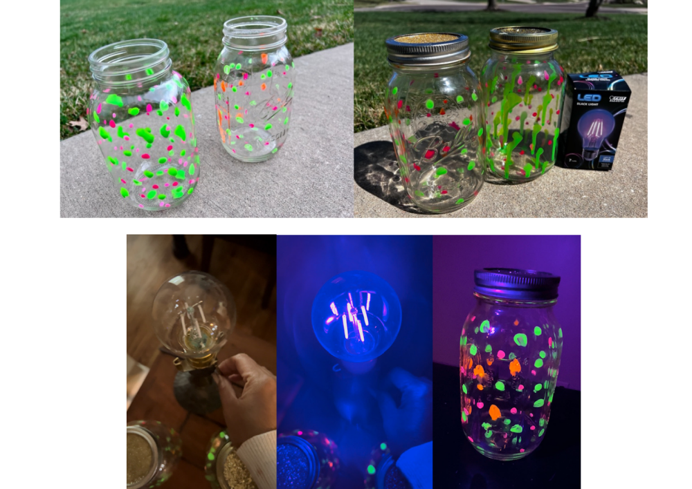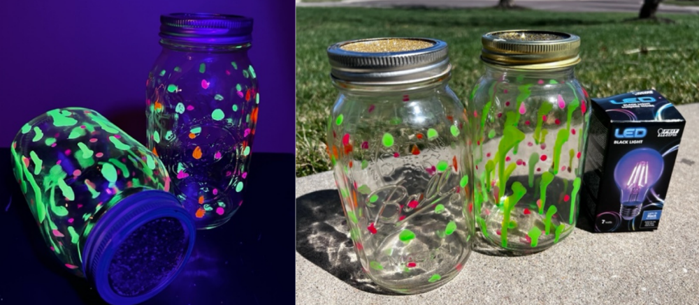 Last step, activate the GLOW! There are 2 ways to go about activating the glow paint. You can let it sit in the sun or under a light bulb for a while. It will glow in a very dark room or pitch black in the nite. Or you can create instant fun with using a black light bulb and it will glow instantly.