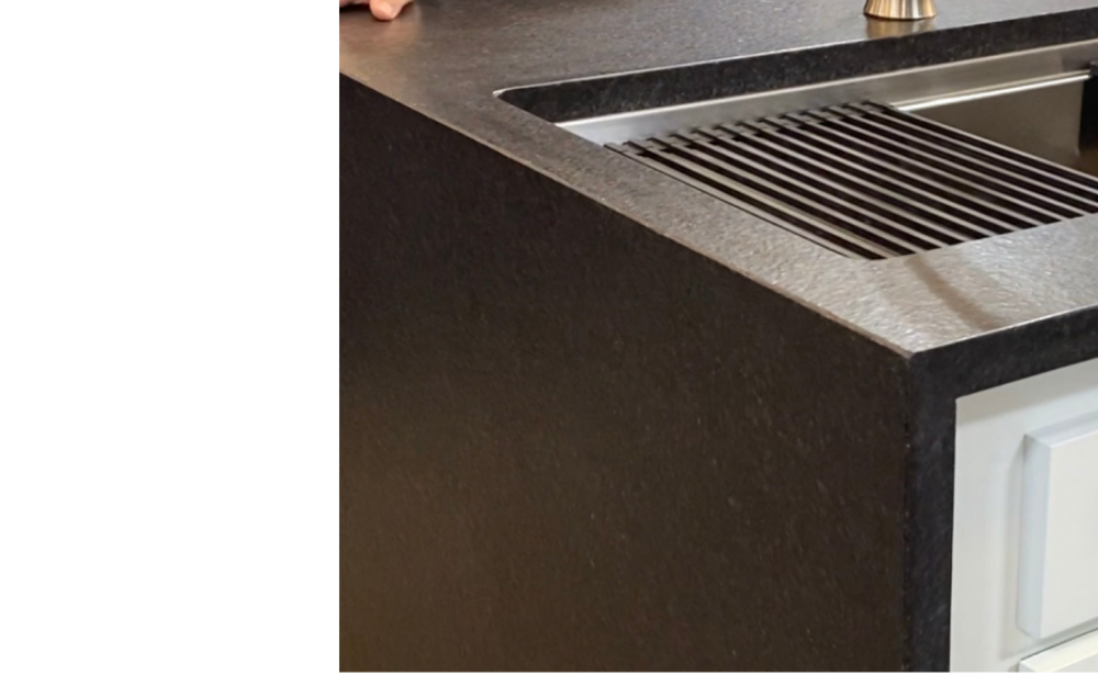 This black pearl countertop with honed finish has gained a lot of popularity among our customers. It has a neat leathery texture. It's strong and very easy to clean. May we point out the wrap around waterfall kitchen countertop is great for island and stand alone cabinet as well.