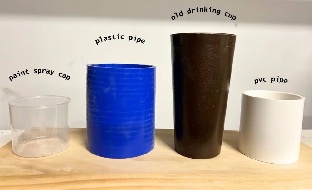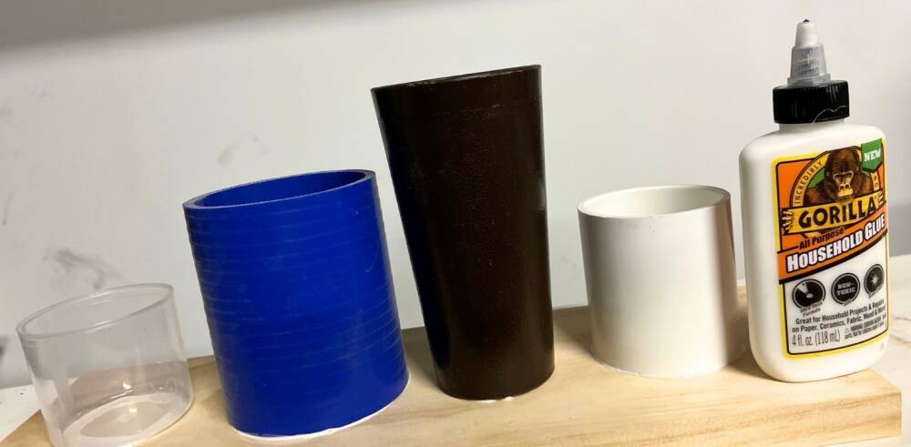 We used 2x4 scrap lumber that is wide enough to fit the 4 holders. Choose different heights of containters but you might want to keep them around the same diameter so they line up nicely in a row. Consider what you will use it for. We plan on some typical table top stationary such as pens, scissors and paper clips for example. You can use household glue or a glue gun.