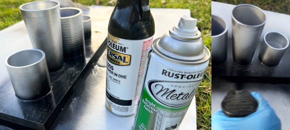 We went with a 2 tone effect using 2 different paint spray. Our base coat is specialty silver metallic paint. After letting the first coat dry, we start creating an ombre effect with RUST-OLEUM® Universal® black spray. We highly recommend this particular spray that allows you to spray at any angle. To create this look, simply point the can to the base and lightly press the sprayer. Allow the color to go up just at the base of the holders.