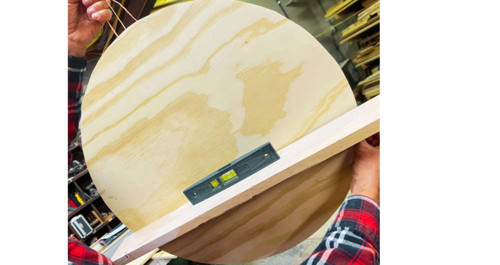 Make sure to use the level to test the weight distribution as the 2x4 shelf can make it uneven when hanging. You will need to adjust the position of the hanging hardware if tilting occurs.