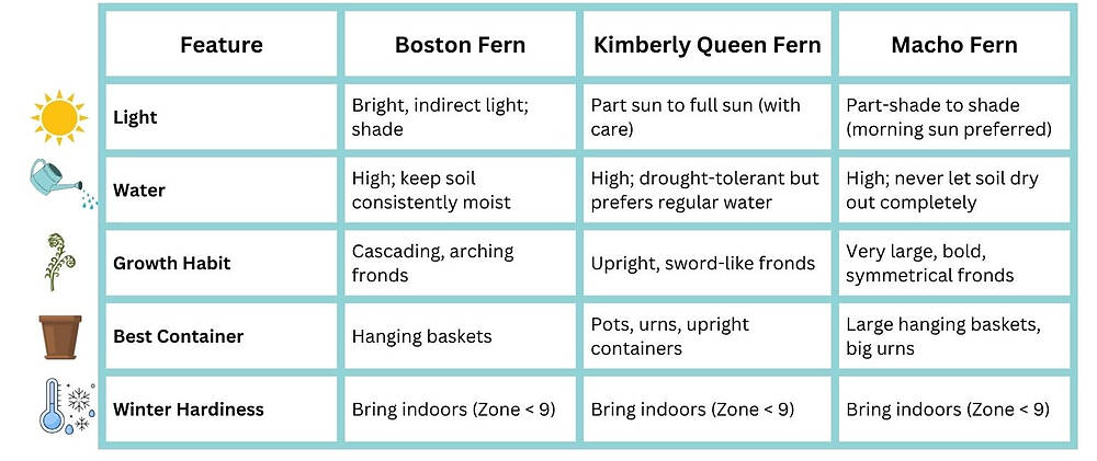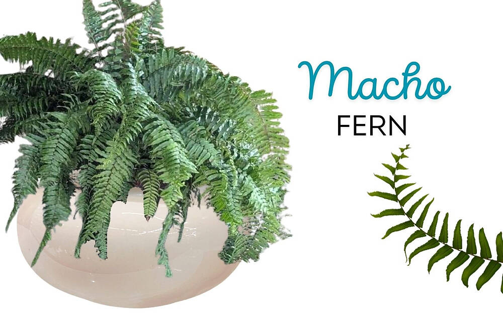 Macho Ferns (Nephrolepis biserrata) are large and bold, growing up to 4 feet tall with fronds that can reach 5 feet wide, making them a statement plant for large hanging baskets or urns. They prefer part-shade to shade with acidic, airy soil and require consistent moisture but cannot tolerate "wet feet" or waterlogging. Like the other Nephrolepis varieties, they are tropical and frost-tolerant only to 25°F, requiring protection or indoor overwintering in colder regions.