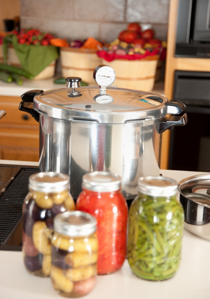 Pressure canning is the only processing method that reaches the high temperature (240°F) needed to safely preserve low-acid foods. It consists of a large pot, a rack insert, and a fitted lid with a dial or pressure valve.  You need to use the jar made specially for canning. Keep in mind you might need to submerge them in extremely hot water. You don't want to compromise your food being under pressure. The lids are made to seal the food properly. Never reuse glass jars from other condiments.