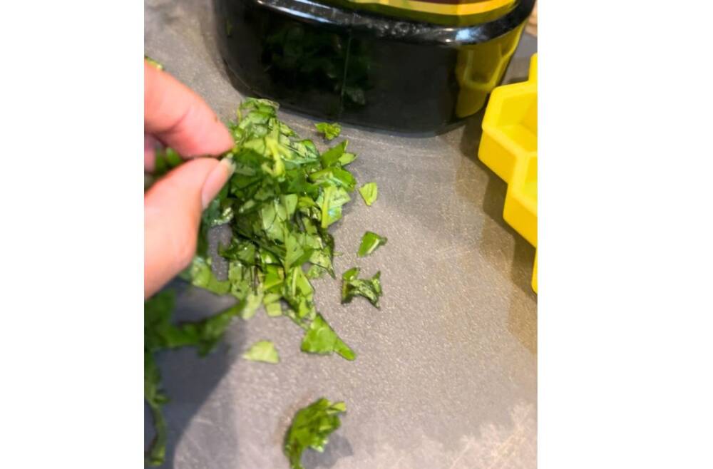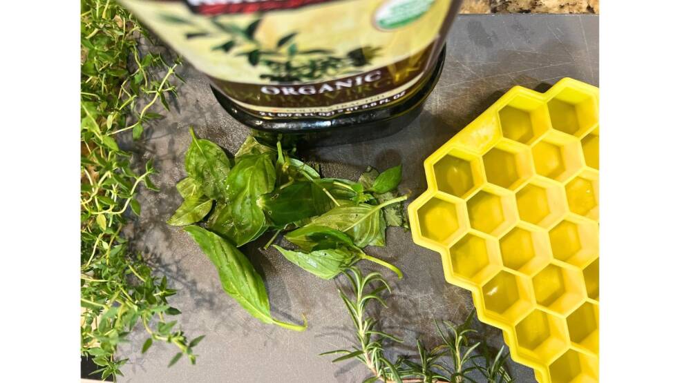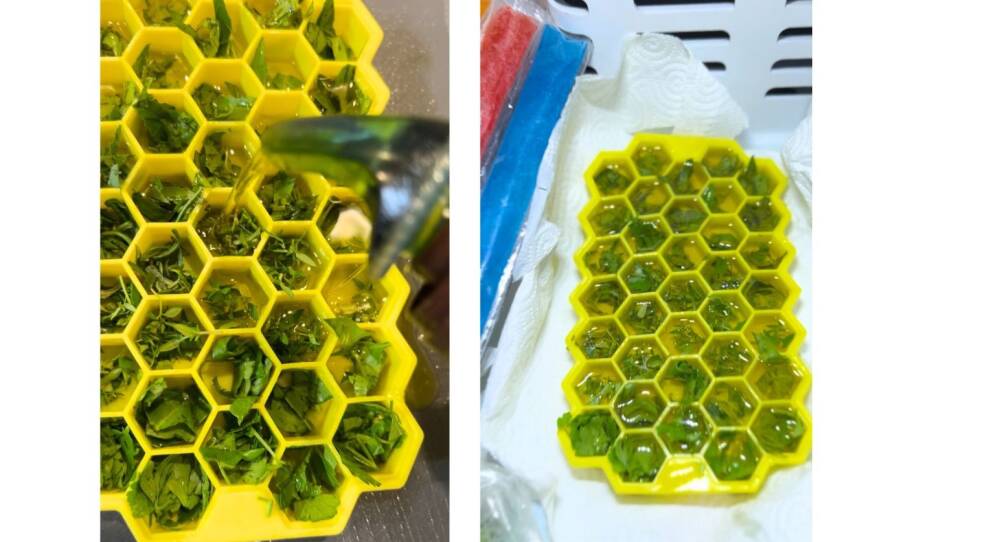Fill the tray with chopped herbs and pour olive oil to fill. Place it in the freezer.