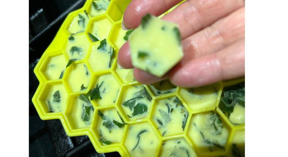 Voila! It's incredibly simple. This is a fantastic way to ensure you never run low on fresh herbs. Keep it stored in your freezer for all your winter cooking needs. Just pop them out and melt them in a hot skillet! Bon appétit!