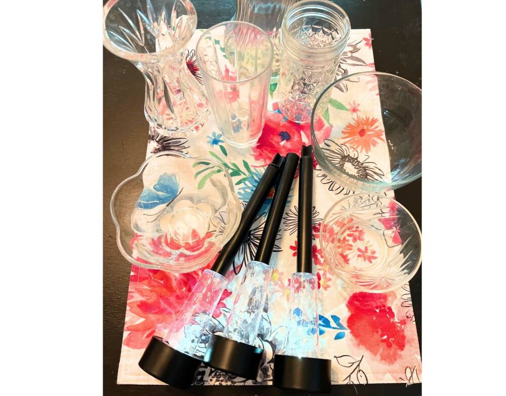 It’s time to declutter the cupboard! We suggest selecting items that feature a variety of designs and intricate patterns. Clear glass is perfect for this project, as it allows sunlight to shine through and makes the glass base illuminate beautifully.