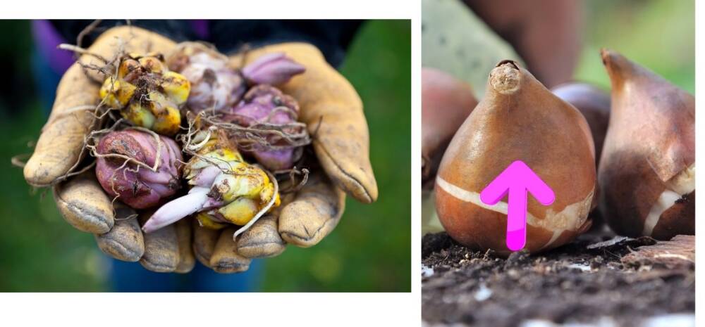 Always plant with the pointing side up. Per the Netherland Company expert, “a general rule is to plant flower bulbs at a depth that is 3x the circumference of the bulb: • Larger bulbs are typically buried about 8” deep • Smaller bulbs are typically buried about 5” deep”