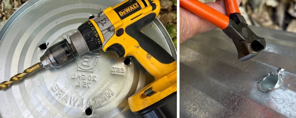 Next, drill about a 1-inch size around the lid for ventilation and drainage. When you drill a metal can, there might be sharp edges. You can snip them off with pliers.