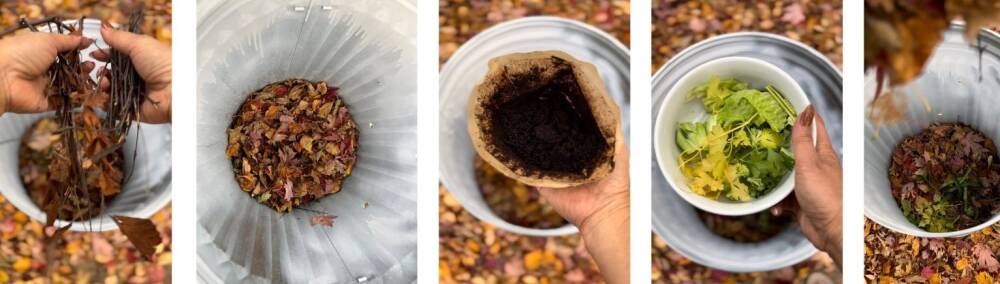Start by using less dense scraps like branches and twigs to promote air circulation. Then start with brown materials that will create more carbon to the pile. Then get out those kitchen green scraps for the next layer to promote nitrogen rich materials. Lightly water between the next layers to add moisture. Don’t forget to use those grass clippings; they’ll prevent the compost from becoming compacted.
