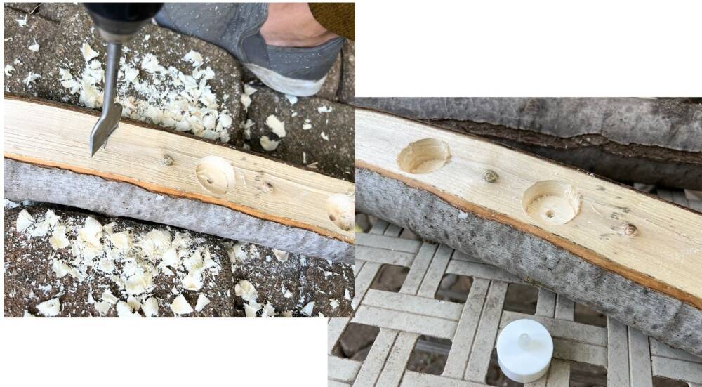 Start drilling. The depth of the holes depends on how you want to display the tealight. We plan to make it easy to remove or replace tealights. Using a 1.5" drill bit size makes the holes a bit snug. We can always wiggle the bit around the make the hole bigger.