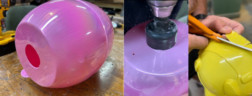 First drill a good size opening to fill the cement. We were successful with using a drill hole saw on the giant egg. For the bunny, you can simply use scissors to make an opening on the bottom of each side.