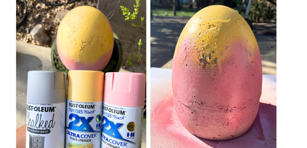 To create this blending look, we used 3 colors for our giant egg: gray as the all over color. Spray the top with yellow, You can even let the paint drip. We used paper towels to wipe it lightly to create imperfection. Then lightly spray the pink on the bottom. Have fun with this! You can even top the egg with gold paint. It will give your egg a little shimmer displaying it outside.