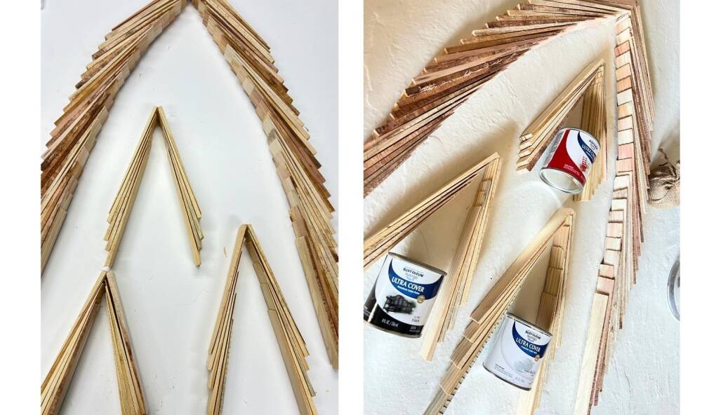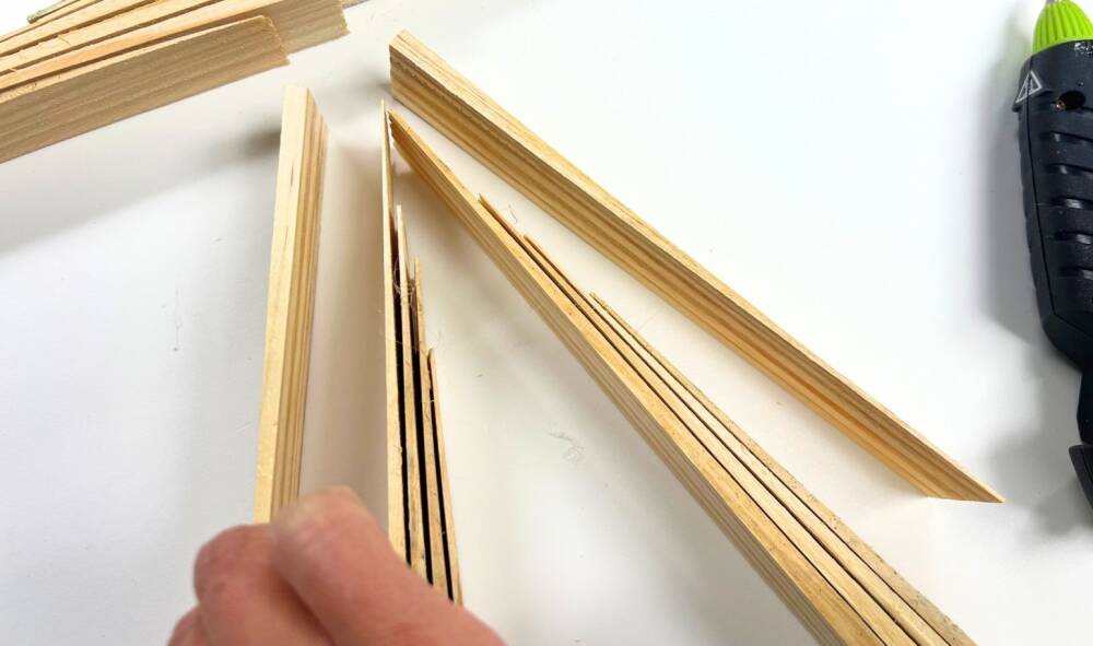 Place a ruler or a piece of wood to make sure both sides are on an even surface. The shim’s thickness is gradual from thick to really thin towards the other end. First start stacking the shims by pointing down the thicker end as pictured. Start layering it up to your desired height and width. Turn both sets of shims and connect to make the tree.