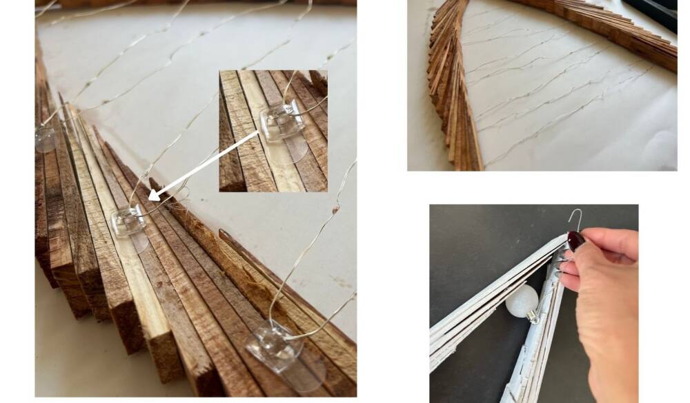 The big tree is perfect to string some lighting to it. Flip the tree and attach the hooks on the back side. Make sure the hooks are facing outward so they can hold the wire. We decided to add a small ornament to the peak of our little tree village using the ornament wire hook.