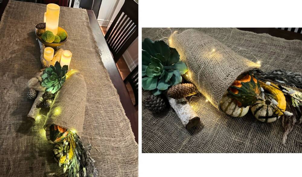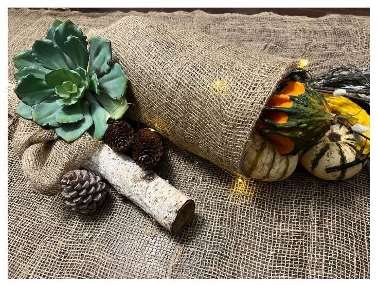 Let’s jazz up your table. Grab some burlap as a table cloth and let the creativity flow! Dress up your centerpiece cornucopia with Mother Nature's treasures—think pine cones, fluffy pampas grass (and yes, you can totally dye it! (See how), acorns, birch branches, and those quirky green hedge apples for a pop of color! And don’t forget to light it up!