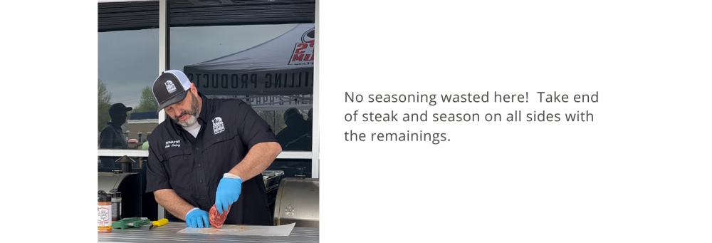 There is no ONE all-purpose rub in Jonh's recipe book. You should layer your rubs!. If you want subtle savoring flavors, you need to layer your seasonings. In his mouth watering demo, John used 3 of his signature blends he has perfected: Steak Shake, Big Red Beef and finished with Holy Moley that gives it smoky flavors. We know, first thing you thought, bet that was salty! That's the thing, good rub will have less salt, this allows you to do layering. He uses oil spray first and then begins layering.