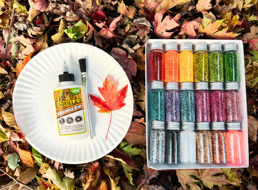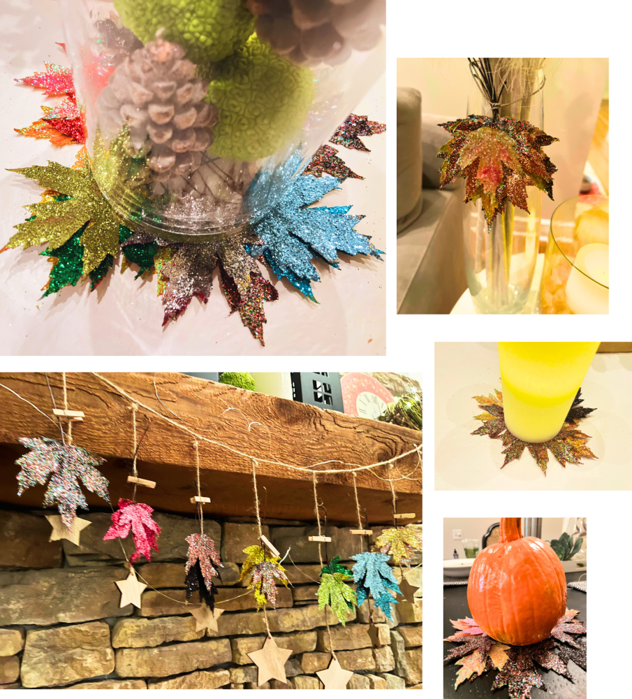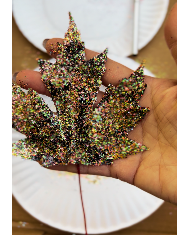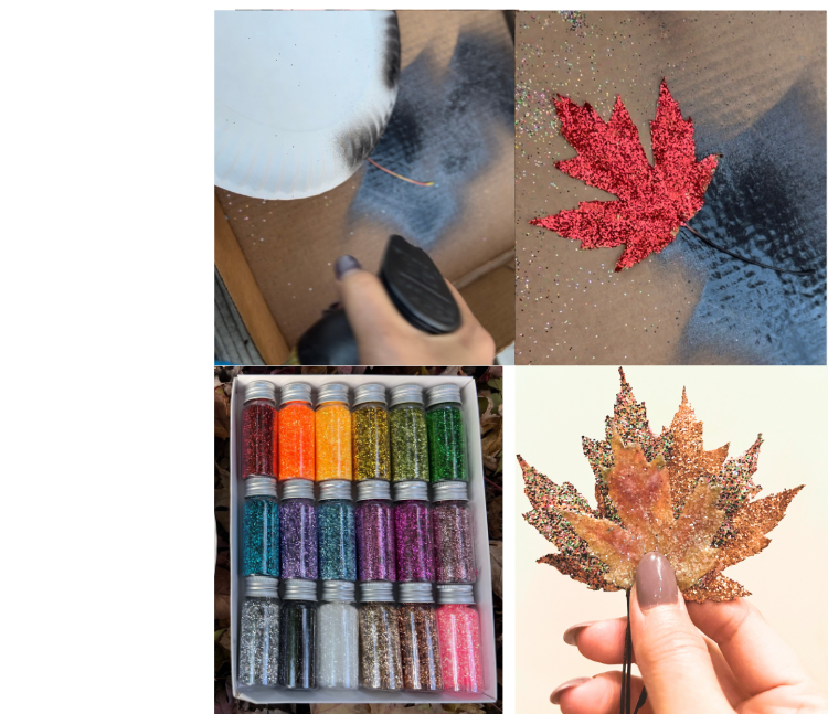 Fun awaits when the leaves are falling and it doesn’t necessarily mean all brown or beige! ! We have an easy project kids and crafty fans are gonna love! All you need is household glue, a paint brush, spray paint and glitters of your choice.