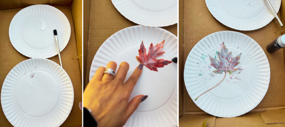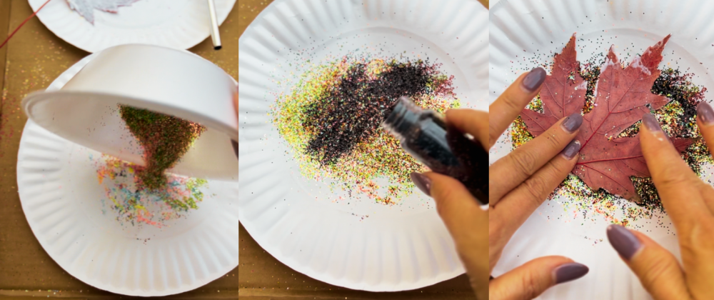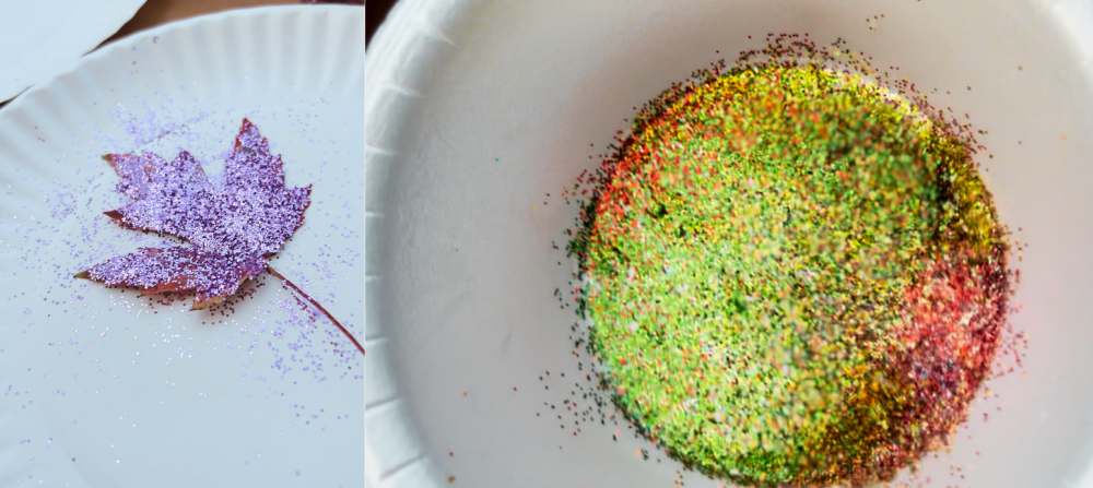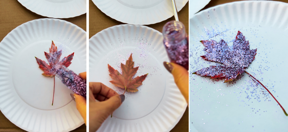 For thicker coverage, we sprinkle glitter straight onto the glued leaf first. Shake off the excess and dabbing on the back of the leaf.