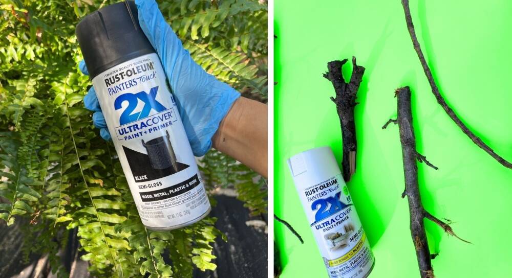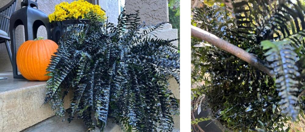 We used black spray paint to create the haunted halloween fern. It is a bit tricky to get good coverage. We used about half a can to cover. Use a tree branch to lift the fern leaves to spray on the under side. Black works well as the color pops nicely against the bright fall mums and pumpkins. Try purple!