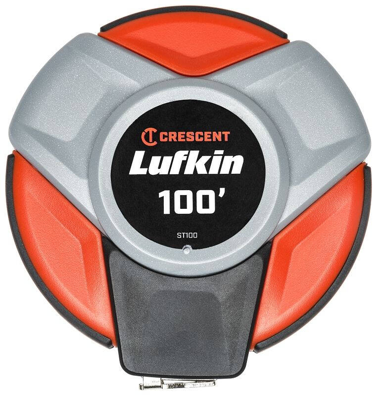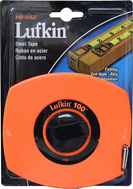 Crescent Lufkin Tape Measure, Graduation: 1/8 in, 1 mm, Dual-Sided Blade, 100 ft L Blade, 3/8 in W Blade, Blade Thickness: 0.005 in, Blade Color: Black/Yellow, Steel Blade, Case Type: Closed, Case Color: Bright Orange, Case Material: Plastic, End Type: Hook, Rewind Type: Manual, Resists: Impact
