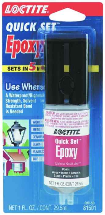 Loctite® epoxy quick set is a two-part adhesive consisting of an epoxy resin and a hardener. When mixed in equal volumes, the resin and hardener react to produce a tough, rigid, high strength bond in 5 min for most projects. Available in a convenient dual syringe which delivers equal parts of both components every time. Loctite® Epoxy Quick Set can be used as an adhesive for a wide range of materials or as a versatile filler for gap filling, surface repairs and laminating. Loctite® Epoxy quick set does not shrink and is resistant to water and most common solvents. It can be tinted with earth pigments, cement or sand for color matching. It can be sanded and drilled.
