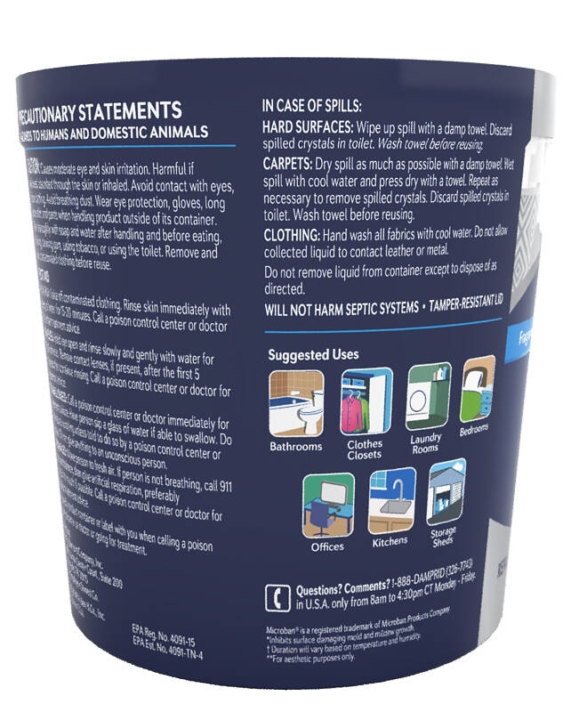 For bathrooms/laundry rooms, bedrooms, closets, cabinets, offices/supply closets, gym lockers, storage spaces and stored boats/RVs/classic cars. Removes excess moisture from air. Eliminates musty odors and reduce allergens caused by moisture. Prevents mold and mildew stains, protects against moisture damage and turns stagnant air into fresher, healthier air. Can be refilled and reused time and again. For space that is 150 to 250 sq. ft.