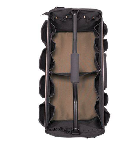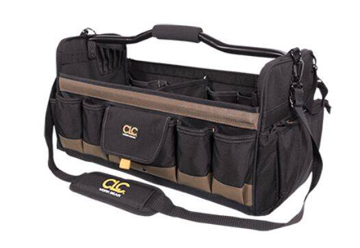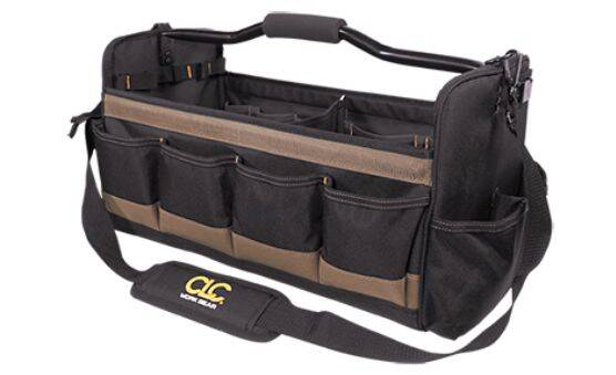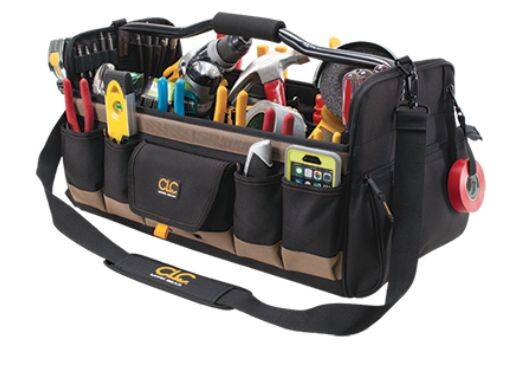 A premium quality open top, soft sided tool box with an extra large center section plus 27 pockets and 6 sleeves for ample tool storage, includes an electrical tape strap, tape measure clip, a sturdy bar handle with foam grip, and padded shoulder strap.