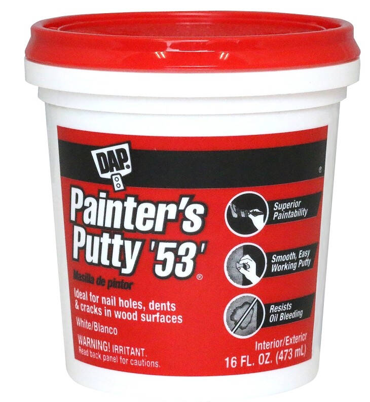 DAP® professional painter's putty is a smooth, easy working putty designed for the special needs of professional painters. It is ideal for filling small holes and cracks in interior or exterior surfaces such as baseboards, windowsills and woodwork. It has exceptional adhesion and resists oil bleeding. DAP® professional painter's putty may also be used to glaze wooden window sashes.