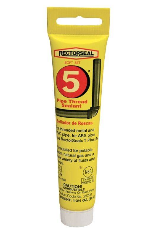 Rectorseal No 5® pipe thread sealant is a soft-set, slow drying compound which seals, lubricates and protects threaded pipe and fittings. It can be pressurized immediately for piping up through 2 in and 100 psi (for natural gas, air and water only) and is ideal for application with a wide variety of fluids and gases, including potable water applications. Recommended for use on threaded galvanized steel, iron, brass, copper, aluminum, stainless steel, polyethylene, fiberglass reinforced and PVC pipe.