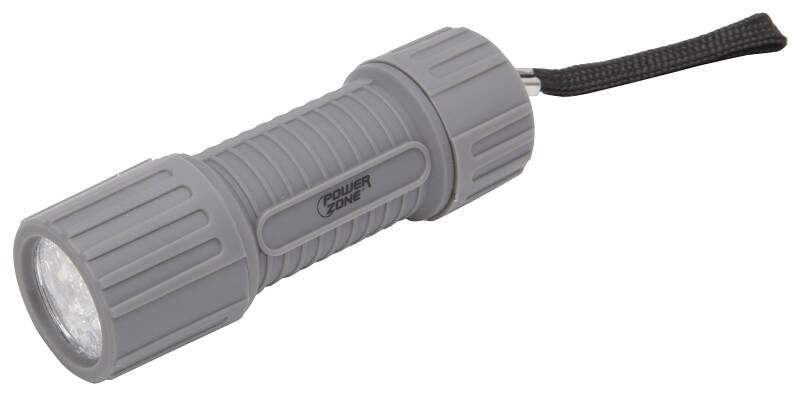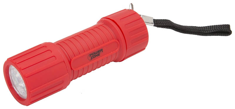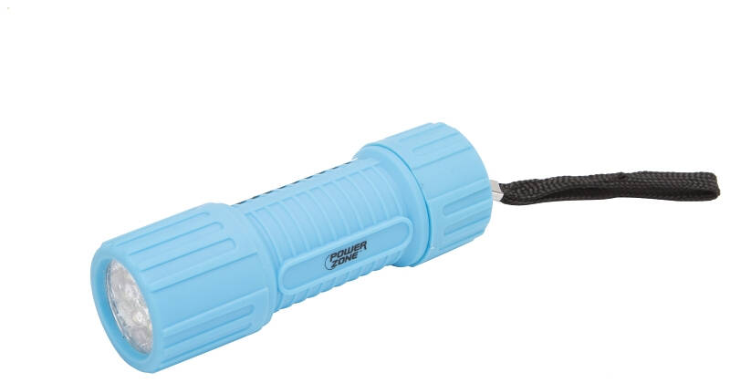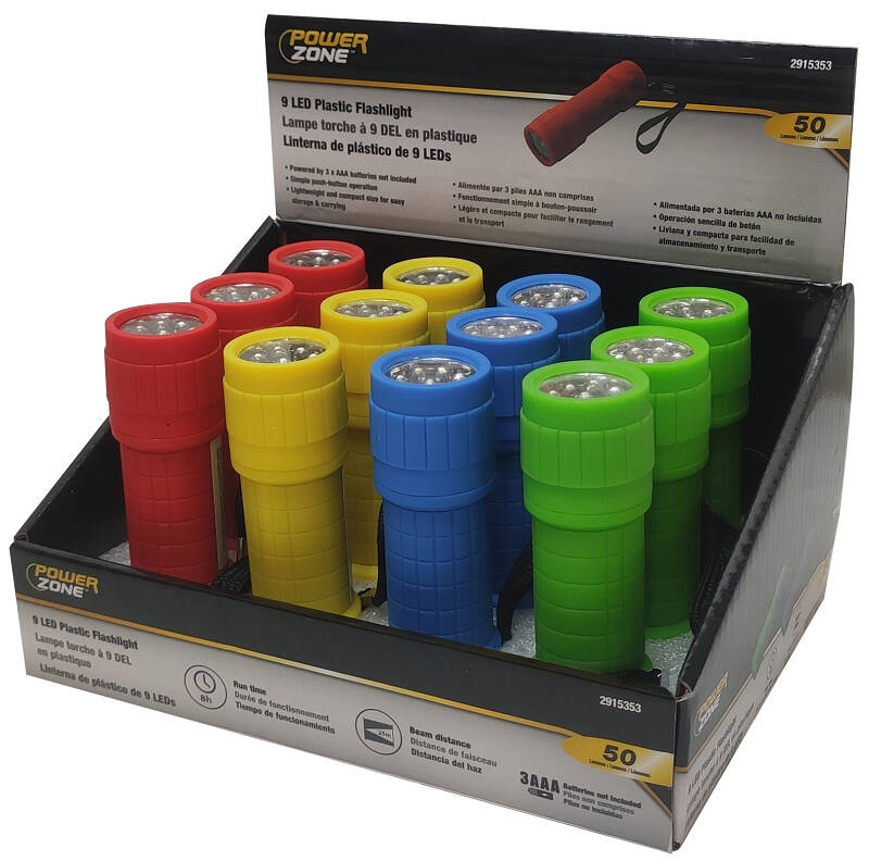 LED Plastic flashlight, 12 hrs runtime. 50 lumens. Powered by 3 AAA batteries, not included. Display box contains three pieces each: blue, green, red and orange.