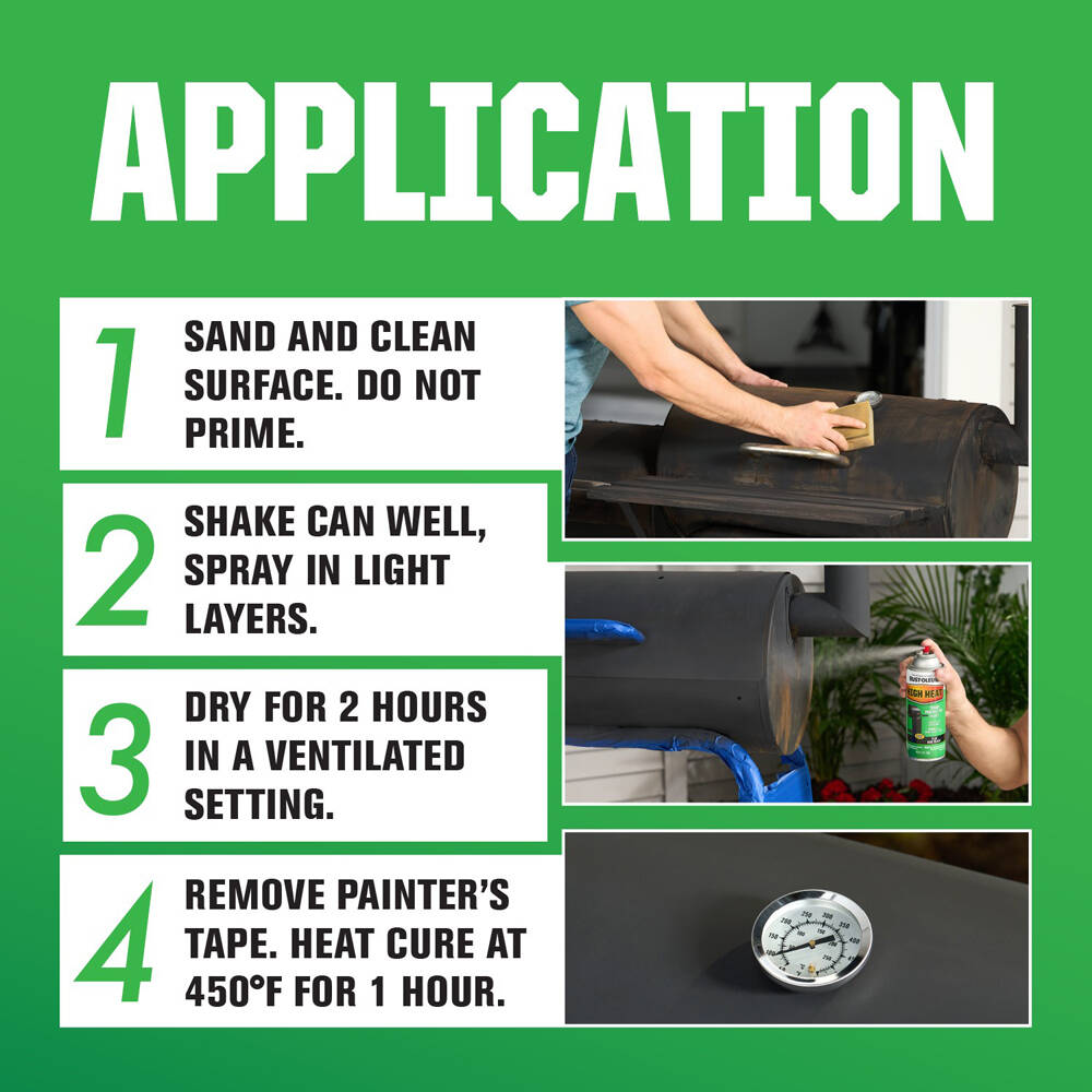 Rust-Oleum High Heat Spray Paint offers the perfect solution to refresh and renew metal surfaces exposed to high heat. Durable, high heat formula retains color after repeated heating for long lasting protection. Protective enamel creates an excellent rust preventative coating.
