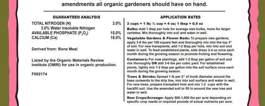 Ingredients Bone Meal. Listed by the Organic Materials Review Institute for use in organic production.