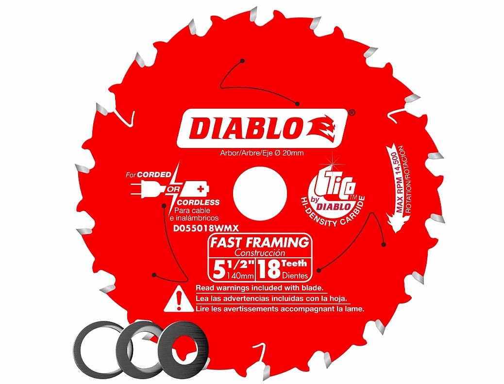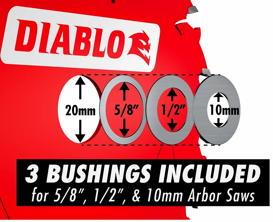 Diablos fast framing saw blades produce accurate, smooth cuts on framing materials without bogging down your cordless saws battery. This 20mm arbor saw blade includes three additional bushings that allow your blade to also fit on 1/2 in , 5/8 or 10mm arbor saws. These blades feature Diablo made TiCo Hi-Density Carbide engineered exclusively to maximize life, performance and durability in wood cutting applications. The thin kerf body minimizes material removal and requires less cutting power, delivering fast, clean rips and cuts.