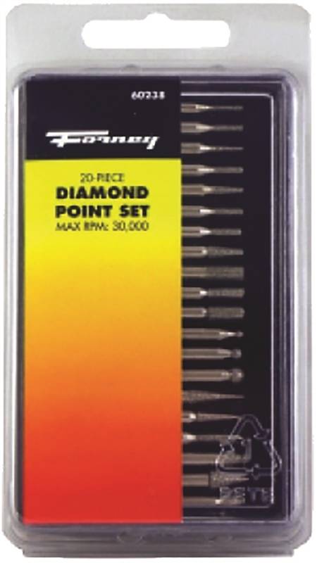20 piece set with assorted shapes and sizes of nickel bonded diamond points. 1/8 in (3.18mm) shank. Excellent for deburring, etching and smoothing of glass, plastic, ceramics and metals.