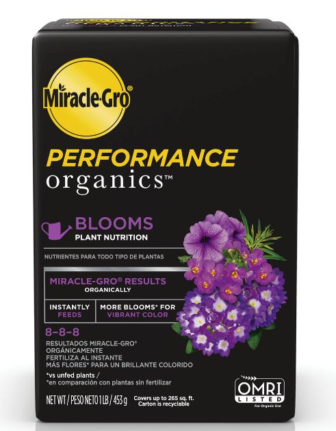 Miracle-Gro Performance Organics Blooms Plant Nutrition is specifically formulated with key nutrients for flowering plants. This OMRI listed plant food instantly feeds flowers in ground and in containers. Apply every 7 days using a watering can or a Miracle-Gro Performance Organics Garden Feeder. This season, enjoy more blooms for vibrant color (vs unfed potted plants) with Miracle-Gro Performance Organics Blooms Plant Nutrition.
