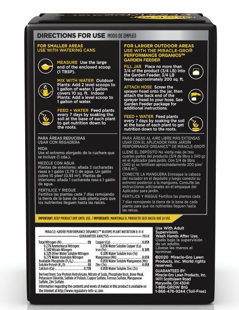 | Coverage Area | Each 1 lb. package covers up to 265 sq. ft. when used with Miracle-Gro Performance Organics Garden Feeder. When Miracle-Gro Performance Organics Blooms Plant Nutrition is mixed with 1 Gal of water, you'll have coverage of up to 10 sq. ft. |