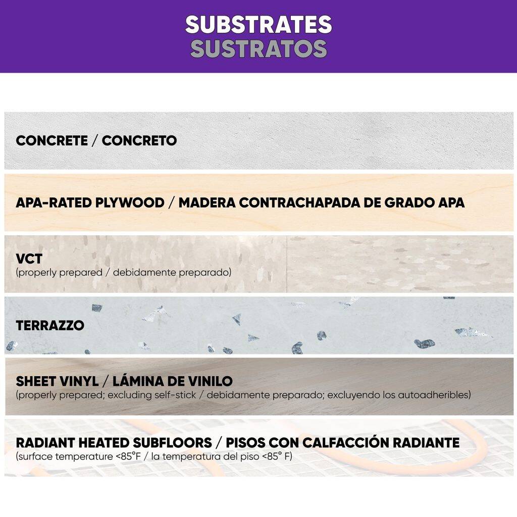 | Usage | For adhering LVP & LVT, WPC, SPC, fiberglass-backed sheet goods, VCT, vinyl-backed carpet tile, cork tile, cork underlayment, and much more, (not for use with self-stick products) |