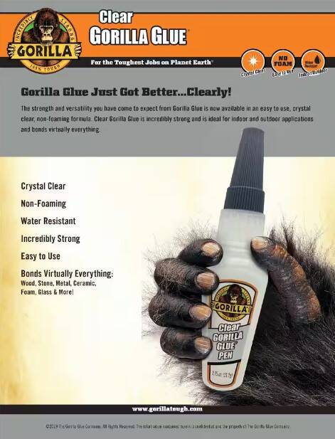 The strength and versatility you have come to expect from Gorilla Glue is now available in an easy to use, crystal clear, non-foaming formula. Clear Gorilla Glue is incredibly strong and is ideal for indoor and outdoor applications and bonds virtually everything.