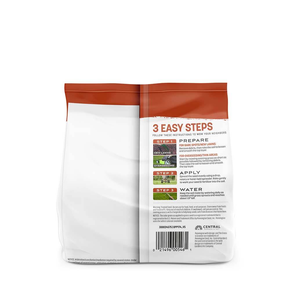 | Precautionary Statement | WARNING: Treated Seed. Do not use for food, feed, or oil purposes. Store away from Feeds and foodstuffs. KEEP OUT OF REACH OF CHILDREN. If swallowed, call poison control. This coating protects with a fungicide to help keep seeds safe from diseases that harm them. Do not apply near water, storm drains, or drainage ditches. Do not apply if heavy rain is expected. Apply this product only to your lawn/garden, and sweep only product that lands on hard surfaces back into the lawn. Check with your local cooperative extension agency for management practices or city government to understand fertilizer regulations. See product label for extended warnings, directions, and storage & disposal information prior to use. |